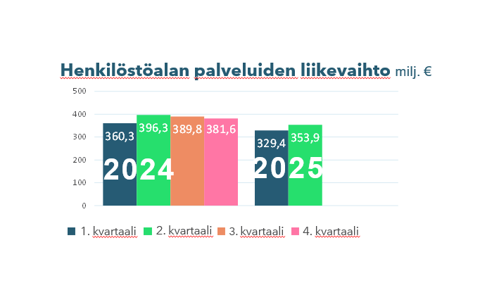 Henkilöstöalan kokonaisliikevaihto, joka sisältää vuokraus-, rekrytointi-, ulkoistus-, sekä lisäpalvelut, oli vuoden 2025 toisella kvartaalilla huhti-kesäkuussa 353,9 miljoonaa euroa. Liikevaihto laski viime vuoden vastaavaan aikaan verrattuna 10,7 prosenttia.