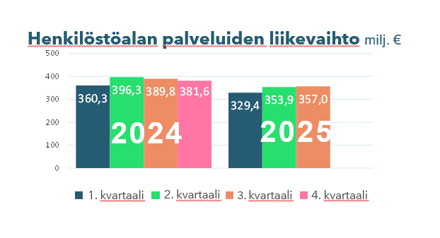 Henkilöstöalan kokonaisliikevaihto, joka sisältää vuokraus-, rekrytointi-, ulkoistus-, sekä lisäpalvelut, oli vuoden 2025 kolmannella kvartaalilla heinä-syyskuussa 357,0 miljoonaa euroa. Liikevaihto laski viime vuoden vastaavaan aikaan verrattuna 9,3 prosenttia.