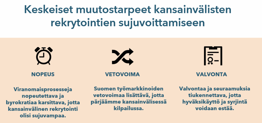 Sujuvat kansainvälisen rekrytoinnin prosessit, veto- ja pitovoiman sekä valvonnan lisääminen tuovat Suomelle elinvoimaa, kilpailukykyä ja taloudellista kestävyyttä